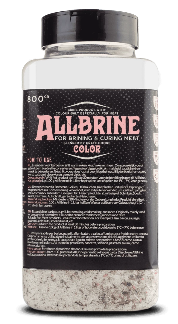 AllBrine Color es un producto universal de salmuera con sal de color. La salmuera es un método antiguo que se utilizaba originalmente para conservar los alimentos. Hoy en día se utiliza la salmuera principalmente porque realza en gran medida la ternura, la jugosidad y el sabor de la carne y el pescado. En América, este método de preparación es más común que en Europa, porque la salmuera cambia la estructura de las piezas más grandes o duras de la carne de barbacoa, haciéndola maravillosamente tierna. AllBrine Color es muy adecuado para la salmuera de carnes y aves que pierden color rápidamente, como la carne de cerdo y vacuno, incluido el pastrami, el pulled pork, las costillas, las salchichas y el bacon. AllBrine Color contiene nitrito. Esto evita el crecimiento bacteriano, prolonga la vida útil de la carne y hace que la carne sea menos sensible a la temperatura.