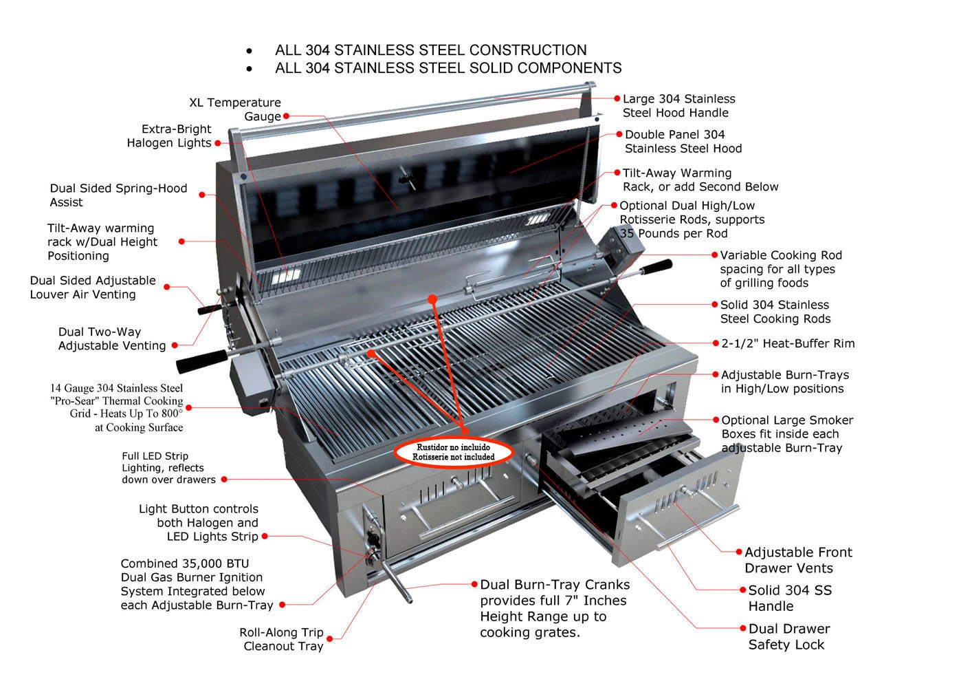 Detalles a destacar de esta barbacoa de Sunstone es que por ejemplo la estructura de Acero Inoxidable de grado 304 está completamente soldada para una mayor resistencia y durabilidad, a diferencia de otras marcas del mercado que están soldadas por puntos. La tapa está construida con doble capa con aislante y con los detalles muy bien pulidos que le dan un look moderno y elegante consiguiendo que se integre a la perfección en cualquier espacio al aire libre. Dos robustos quemadores de Acero Inoxidable con una potencia total de 10,3 kW se encargan del encendido del combustible dentro de los dos cajones de carbón y leña de Acero Inoxidable 304 del calibre 14, incluye parrillas de cocción de Acero Inoxidable macizo de 10 mm. de espesor y difusores también de Acero Inoxidable, diseñados de manera tal que prácticamente no tendremos llamaradas cuando cocinemos. Directores de llama de Acero Inoxidable crean zonas de temperatura que le ayudarán a lograr resultados verdaderamente profesionales.