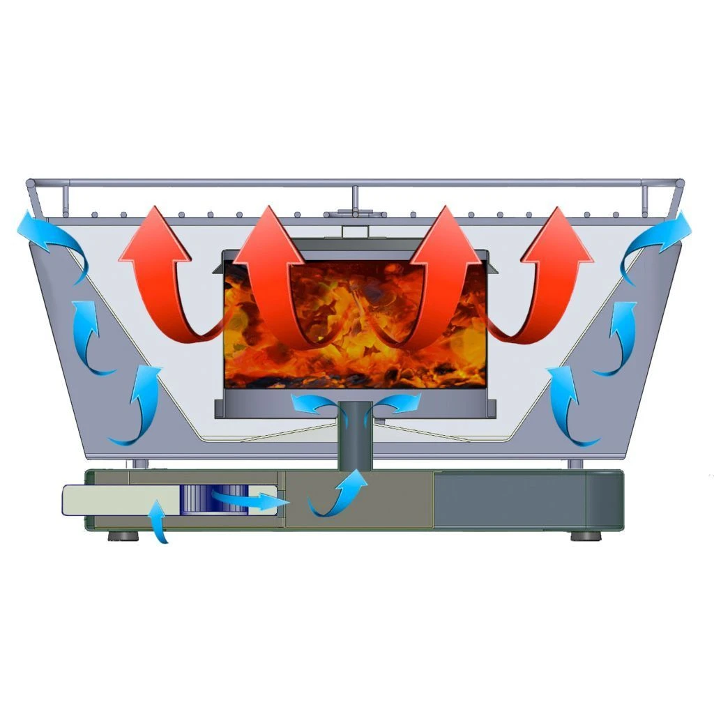 El ventilador sopla aire dentro de la cesta de carbón, lo que acelera el proceso de encendido y se alcanza la temperatura deseada rápidamente. El aire fluye a través del cuerpo de la barbacoa, manteniendo el exterior frío, incluso después de muchas horas de uso.