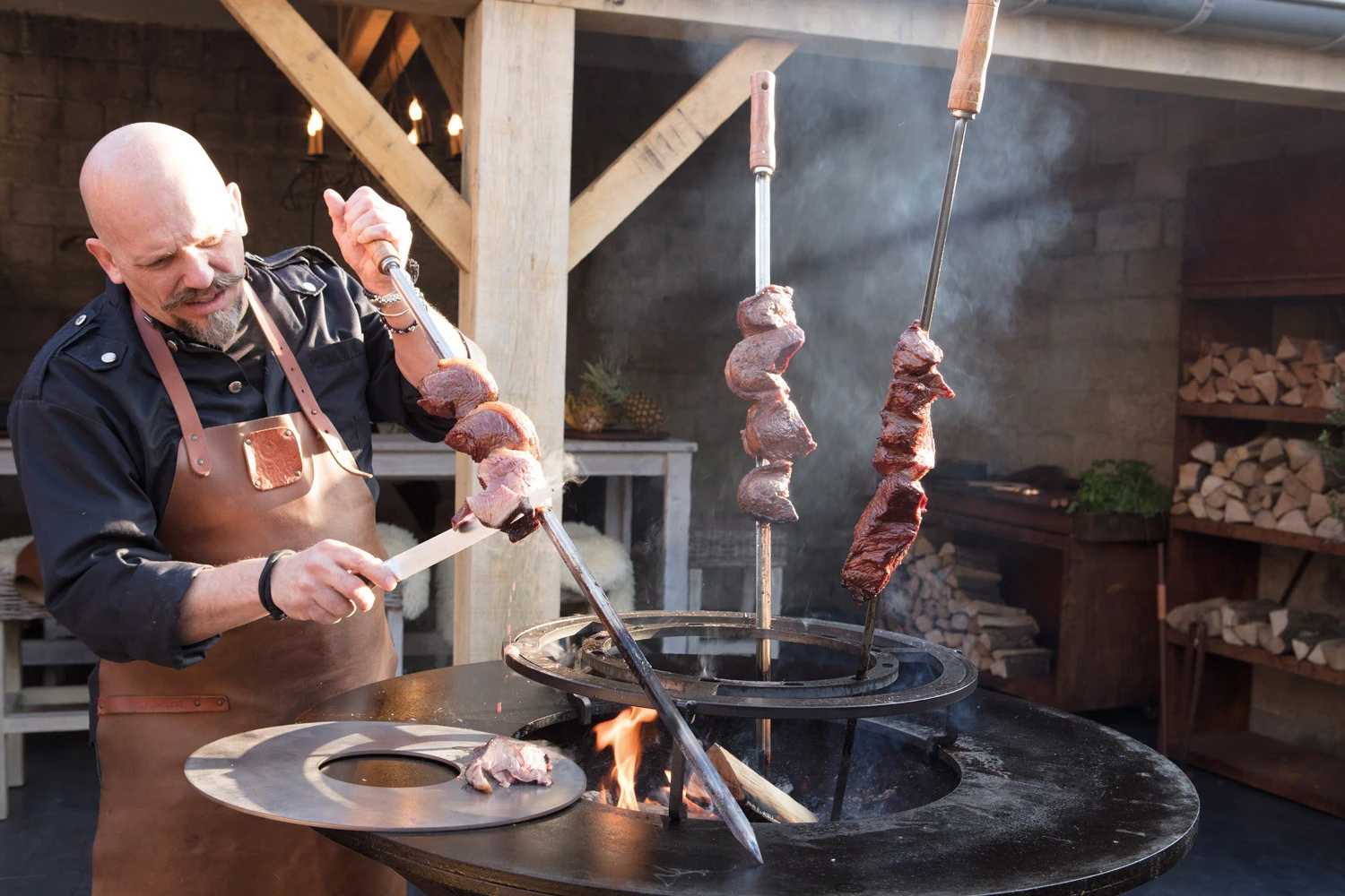 Convierta su Barbacoa de Leña Ofyr Classic 100-100 en una barbacoa de estilo brasileño con este juego de tres pinchos con un soporte circular de acero. Los pinchos tienen mangos de madera para un fácil manejo, y permiten cocinar a laperfección la carne directamente sobre el fuego.