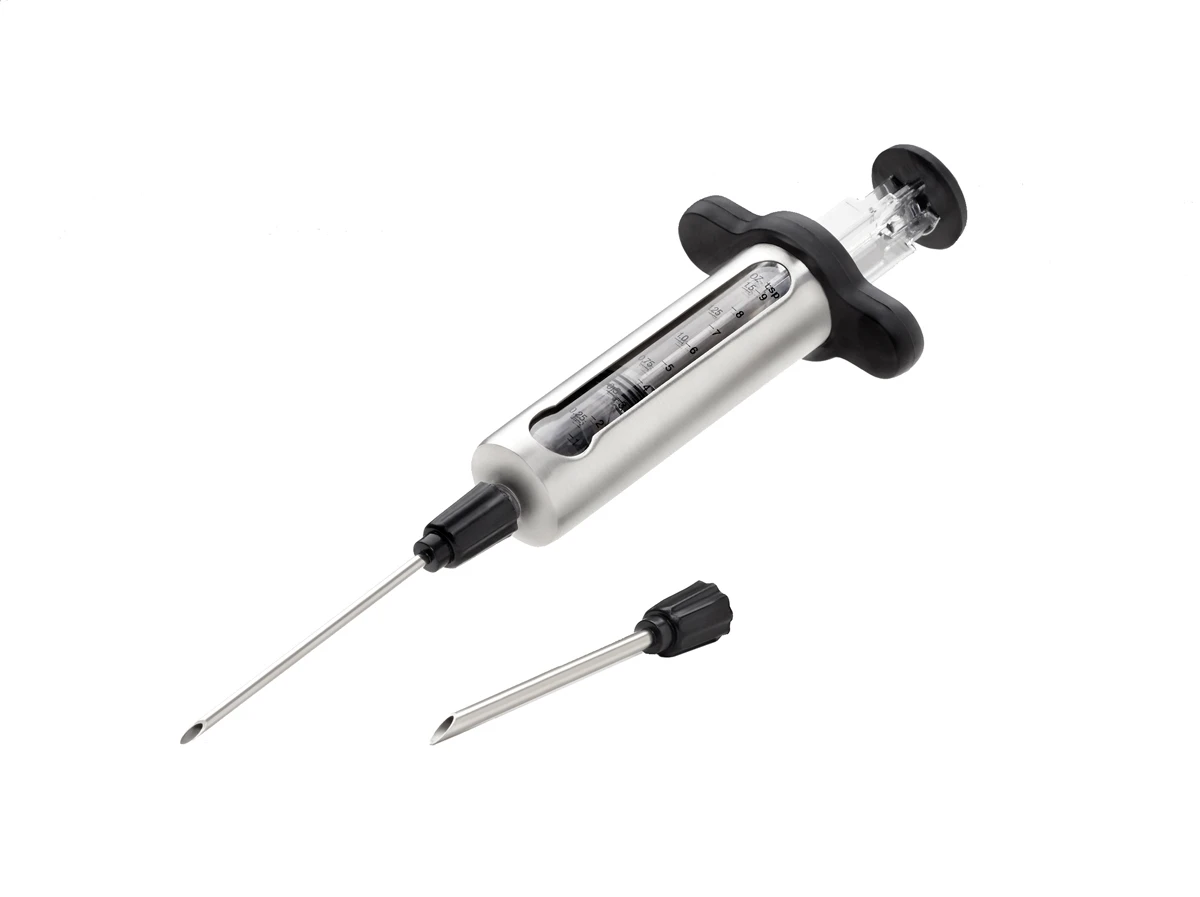El cuerpo del inyector está hecho de acero inoxidable y tiene una ventana transparente. Se suministra con una aguja fina y una gruesa. La aguja más fina es perfecta para salsas y marinadas líquidas, manteca, vino, etc. La aguja más gruesa es perfecta para marinadas y adobos que contienen ingredientes finamente picados como ajo o hierbas.