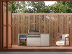 El área dónde va encastrada la barbacoa está revestida con encimera de cuarzo para soportar el calor alto que se emite durante la cocción, protegiendo así los armarios de daños por el calor.