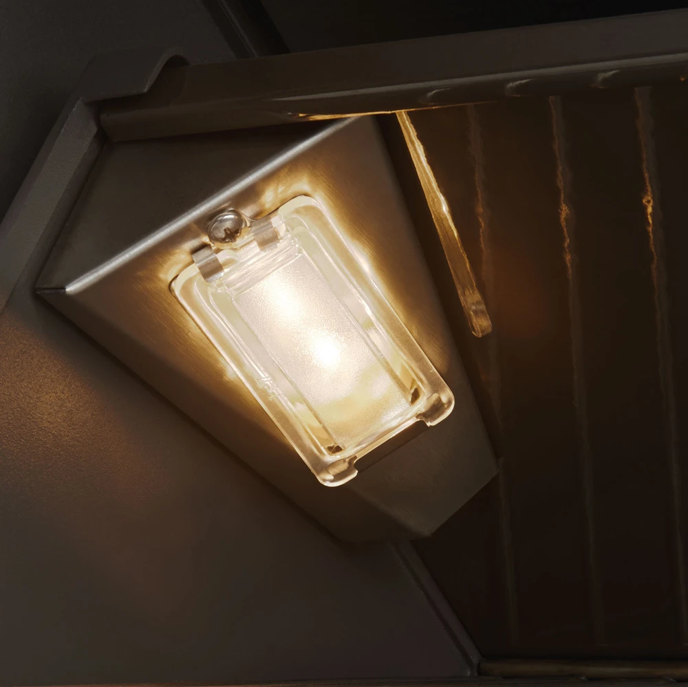 Las luces halógenas interiores iluminan la superficie de cocción para asar por la noche.