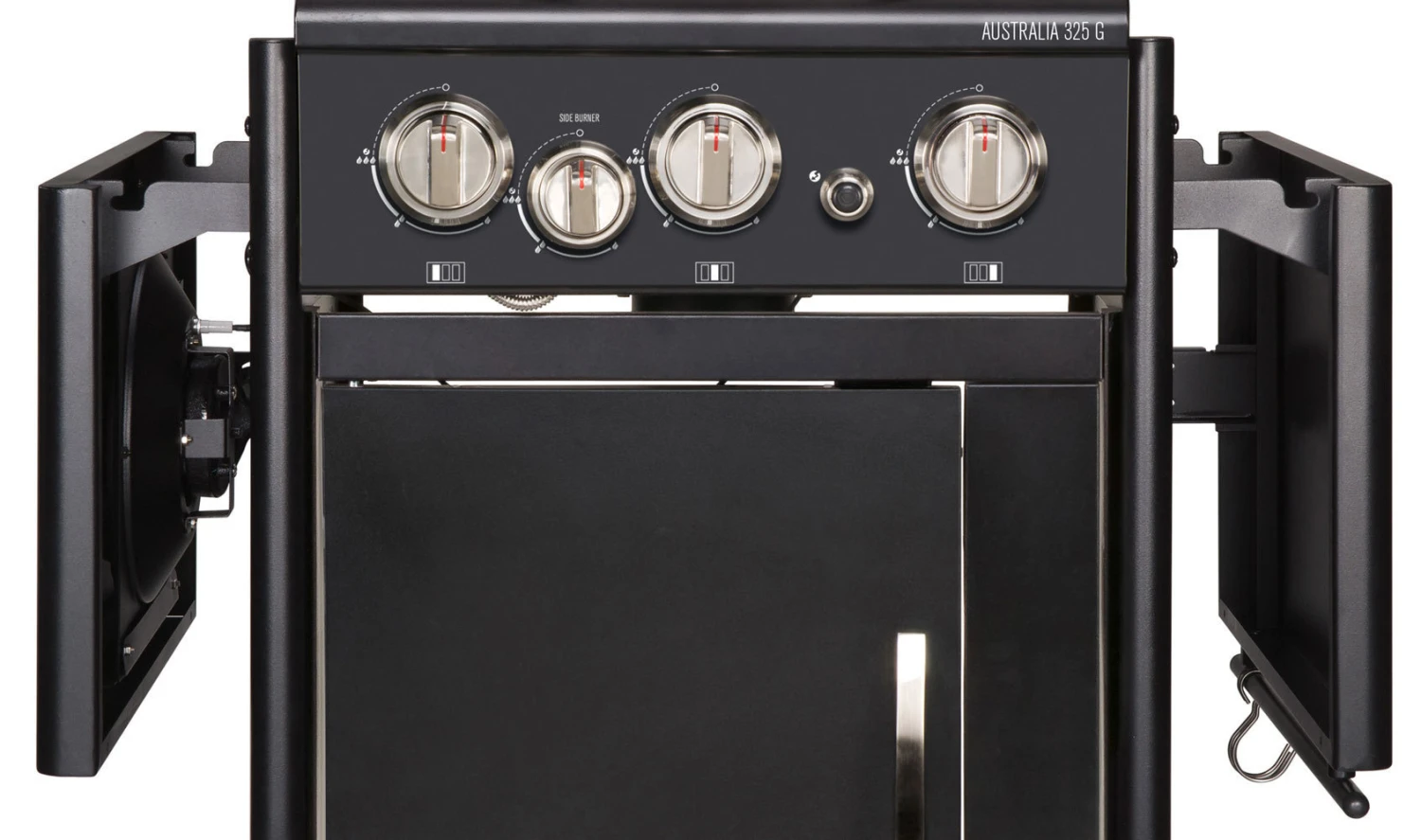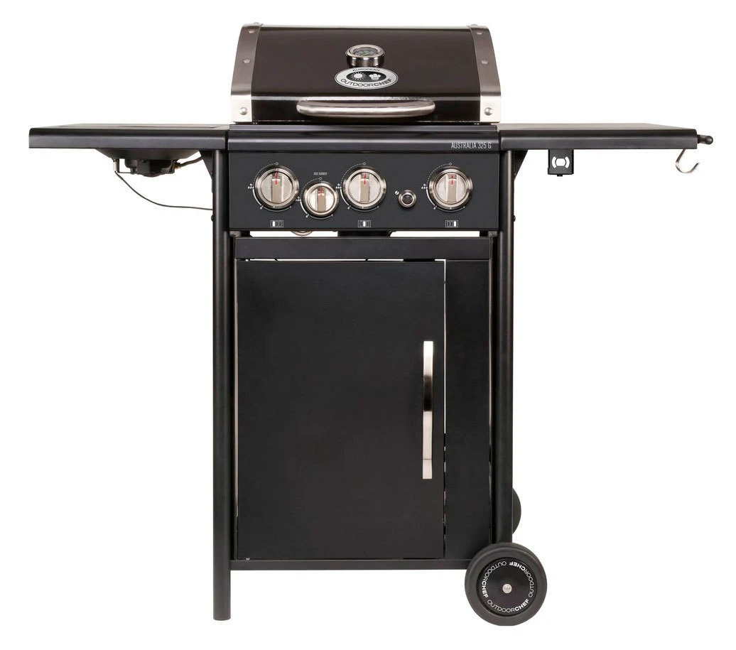 El modelo de barbacoa Australia 325 G incluye tres quemadores de Acero Inoxidable con una potencia total de 7,5 kW, quemador lateral, encendido electrónico, termómetro incorporado en la tapa, mueble con ruedas, puerta con almacenamiento, mesas laterales, y mucho más.
