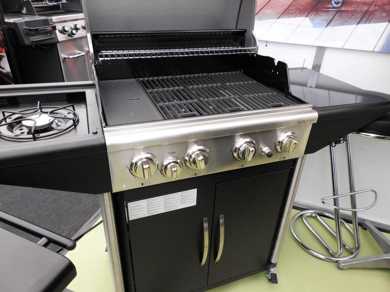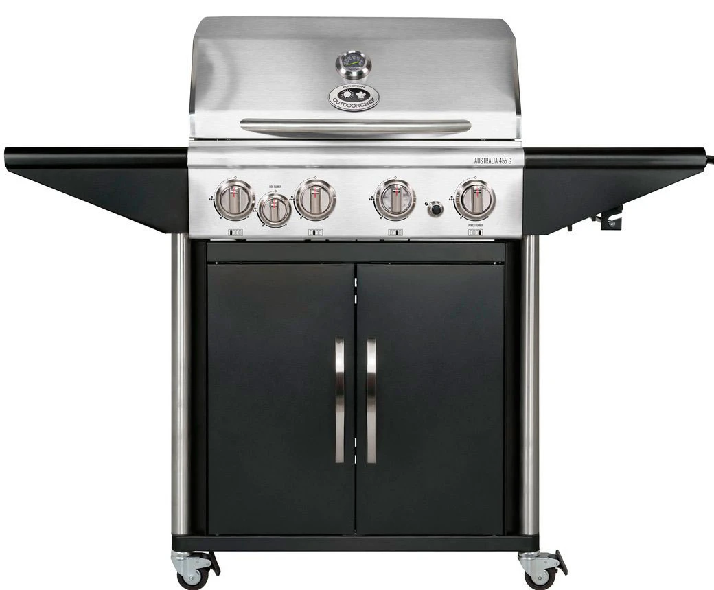 El modelo de barbacoa Australia 455 G incluye tres quemadores de Acero Inoxidable con una potencia total de 12,6 kW, un quemador infrarrojo ultra potente para sellar, quemador lateral, tapa de Acero Inoxidable, patas de Acero Inoxidable, plancha y parrillas de cocción de Hierro Fundido, encendido electrónico, termómetro incorporado en la tapa, mueble con ruedas, puertas con almacenamiento, mesas laterales, y mucho más.