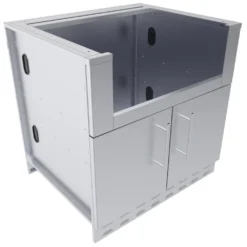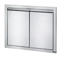 La puerta vertical izquierda Designer Series está fabricada con el mismo acabado que las barbacoas Sunstone y con el tirador de acero pulido.