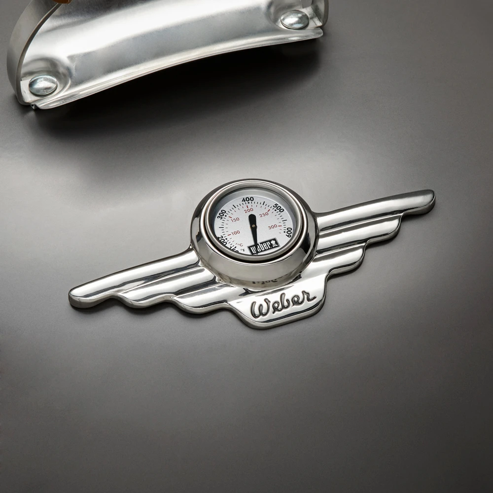 El exclusivo termómetro Weber que encontramos integrado en la tapa vitrificada está diseñado con una insignia inspirada en el capó de los coches clásicos de los Años 50. Gracias al uso del termómetro, se consigue una cocción controlada que asegura los mejores resultados. Un sabor original Weber que marca historia.